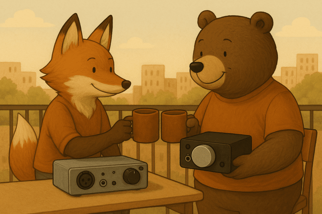 They both stared down at their devices. Fox admired the glowing knobs and sliders on his interface—so many possibilities, so much control. Bear admired the stillness of his DAC/amp—one knob, one job, done well.