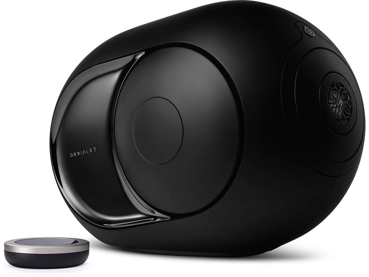 Materials and construction feel premium: dense composite bodywork, metal accents, and a high-gloss finish. The design is compact but substantial; it has a low center of gravity and looks engineered for performance rather than portability. Unique visual and functional elements include the spherical shape that Devialet claims helps create the “implosive soundstage,” and the distinctive symmetrical driver layout that feeds cinematic bass and wide dispersion.