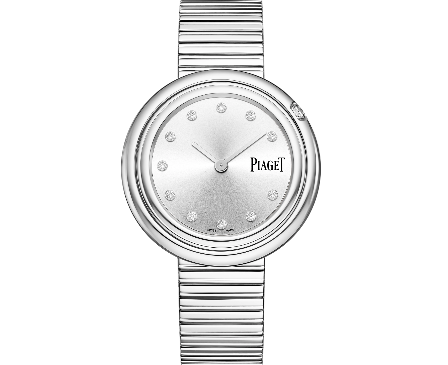 Crafted in silver-toned steel, the watch combines durability with a lustrous finish. The diamond bracelet adds luxurious detail and reflects Piaget’s attention to fine materials and meticulous setting techniques.